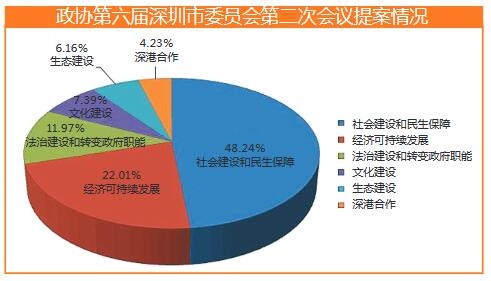 对提案内容统计发现,提案关注率最高的是社会建设和民生保障,共274件,占48.24%;其次是经济可持续发展,共125件,占22.01%;其余依次为法治建设和转变政府职能 (68件,占11.97%)、文化建设(42件,占7.39%)、生态建设(35件,占6.16%)及深港合作(24件,占4.23%)等。(见上图)
