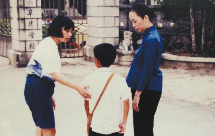 1999年,拍摄《深圳故事——升》时剧照, 右为主演奚美娟,左为李亚威。